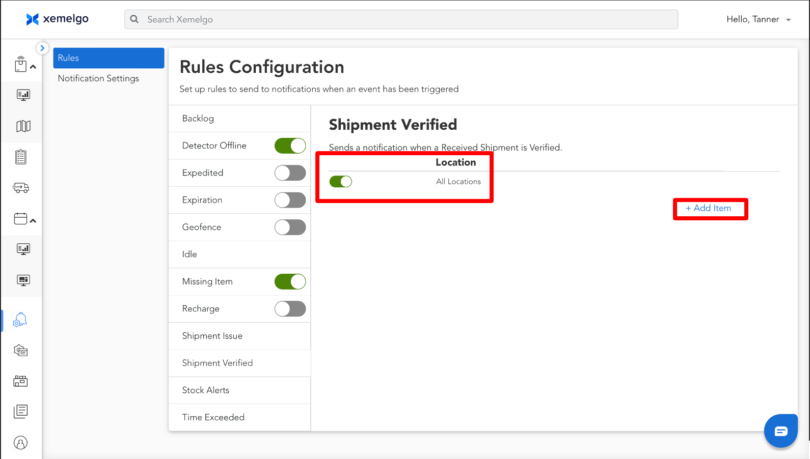 Any user can create additional conditions, where they can add a condition to only receive Shipment Verified alerts for items received at specific locations by clicking + Add Item.